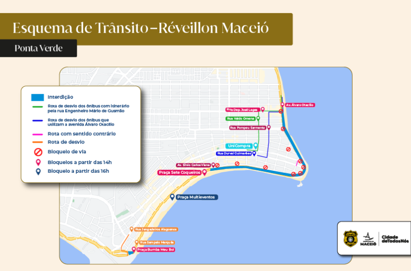 Para garantir a segurança de quem for prestigiar a queima de fogos na orla da capital, o Departamento Municipal de Transportes e Trânsito (DMTT) organizou um esquema de bloqueios. As interdições buscam isolar o entorno do Marco dos Corais, onde é aguardada uma maior concentração de pessoas.