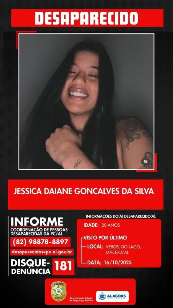 A Polícia Civil, por meio da Coordenação de Pessoas Desaparecidas, sob o comando do delegado Ronilson Medeiros, informou nesta terça-feira (21), que o corpo encontrado nessa segunda-feira, na cidade de Coqueiro Seco, será investigado junto com a Polícia Científica se é da jovem Jessica Daiane Gonçalves da Silva, 20 anos, desaparecida no dia 19 deste mês, no bairro Vergel do Lago.