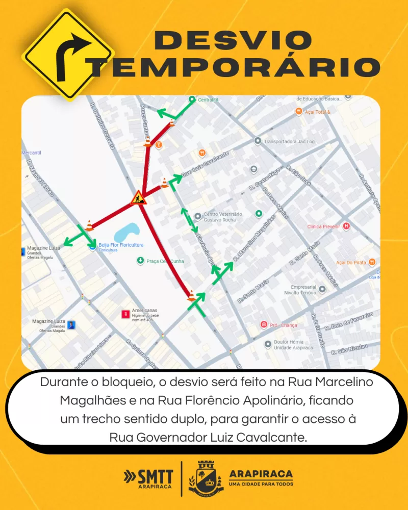 Como desvio, quem vem da Rua Manoel Abreu poderá acessar a Rua Governador Luiz Cavalcante apenas sentido Centro e seguir em frente. Como rota alternativa, a Rua Marcelino Magalhães dará acesso à Rua Governador Luiz Cavalcante. Excepcionalmente nesse período, a Rua Florêncio Apolinário terá um trecho convertido em mão dupla, para dar acesso à Rua Governador Luiz Cavalcante.